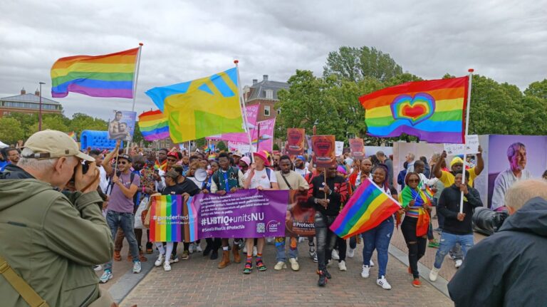 Afgelopen zaterdag hield LGBT Asylum Support tijdens de Amsterdamse Pride Walk met een groep van meer dan 100 lhbtiq+ asielzoekers als protest een sit-in naast de brug van het Homomonument. In navolging van de Pride Walk in Londen waar een groep van Ugandese lhbtiq+ de Pride Walk uit protest met een half uur stillegde, was het in Amsterdam een oproep om aandacht te vragen voor de kwetsbare positie van alle lhbtiq+ asielzoekers in Nederland. Op aanwijzingen van voorzitter Sandro Kortekaas van LGBT Asylum Support, hielden niet alleen de drummers zich stil, maar stopte met deze actie een deel van de Amsterdamse Pride Walk in een halve minuut zittend, verstild protest op de brug naast het homomonument.