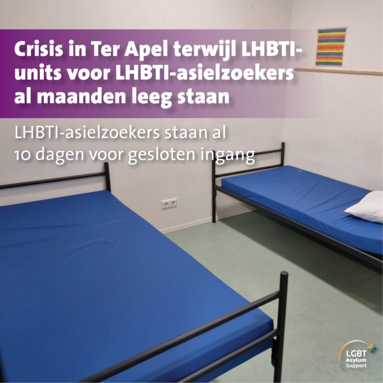 [Ter Apel] Dagelijks meldt LGBT Asylum Support bij het COA meerdere onhoudbare, inhumane situaties van LHBTI-asielzoekers die zich in Ter Apel tevergeefs proberen aan te melden. Het gaat om LHBTI-asielzoekers die volledig nieuw in Nederland asiel willen aanvragen die soms al 10 dagen buiten wachten. Maar ook waar het gaat om herhaalde asielaanvragen waarbij deze recht hebben op opvang maar geen toegang krijgen. Bij de stichting, die vele LHBTI-asielzoekers o.a. in Ter Apel bijstaat, is bekend dat de speciaal uit veiligheid ingerichte LHBTI-units op het terrein van Ter Apel al ruim een maand vrijwel volledig leeg staan. Omdat niet enkel in Ter Apel LHBTI-asielzoekers zich niet kunnen aanmelden maar er ook schrijnende situaties in crisiscentra door het land zijn, heeft de stichting het COA verzocht hierover uitleg te geven. Het COA geeft in antwoord aan dat er geen instroombeleid is voor LHBTI-asielzoekers en dat LHBTI-units worden ingericht op het moment dat er behoefte is bij de bewoners die op de locatie verblijven.