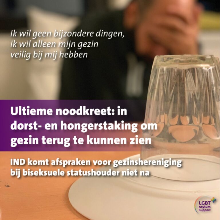 [Hoogeveen, persbericht] Een 40-jarige, biseksuele statushouder, verblijvend in azc Hoogeveen en afkomstig uit Jordanië, ging op 4 januari 2023 in hongerstaking omdat de IND over de termijn ging voor gezinshereniging. Omdat er geen enkele reactie kwam van de IND, is hij sinds maandag 16 januari, na 12 dagen in een veel ernstigere vorm van dorststaking gegaan. De biseksuele man vluchtte halsoverkop vanwege eerwraak en zware mishandeling waarbij zijn zwangere echtgenote en zoontje niet konden meereizen. Eerder ging de man ook al in hongerstaking nadat de IND ook niet binnen de daarvoor geldende termijn uitspraak deed op zijn asielaanvraag. Maanden te laat verleende de IND hem na 5 dagen hongerstaking zijn verblijfsstatus waarna hij gezinshereniging aanvroeg om zijn inmiddels dakloze familie te laten overkomen. De man, ondersteund door LGBT Asylum Support, heeft inmiddels een tweede zoontje die hij nog nooit heeft kunnen vasthouden.